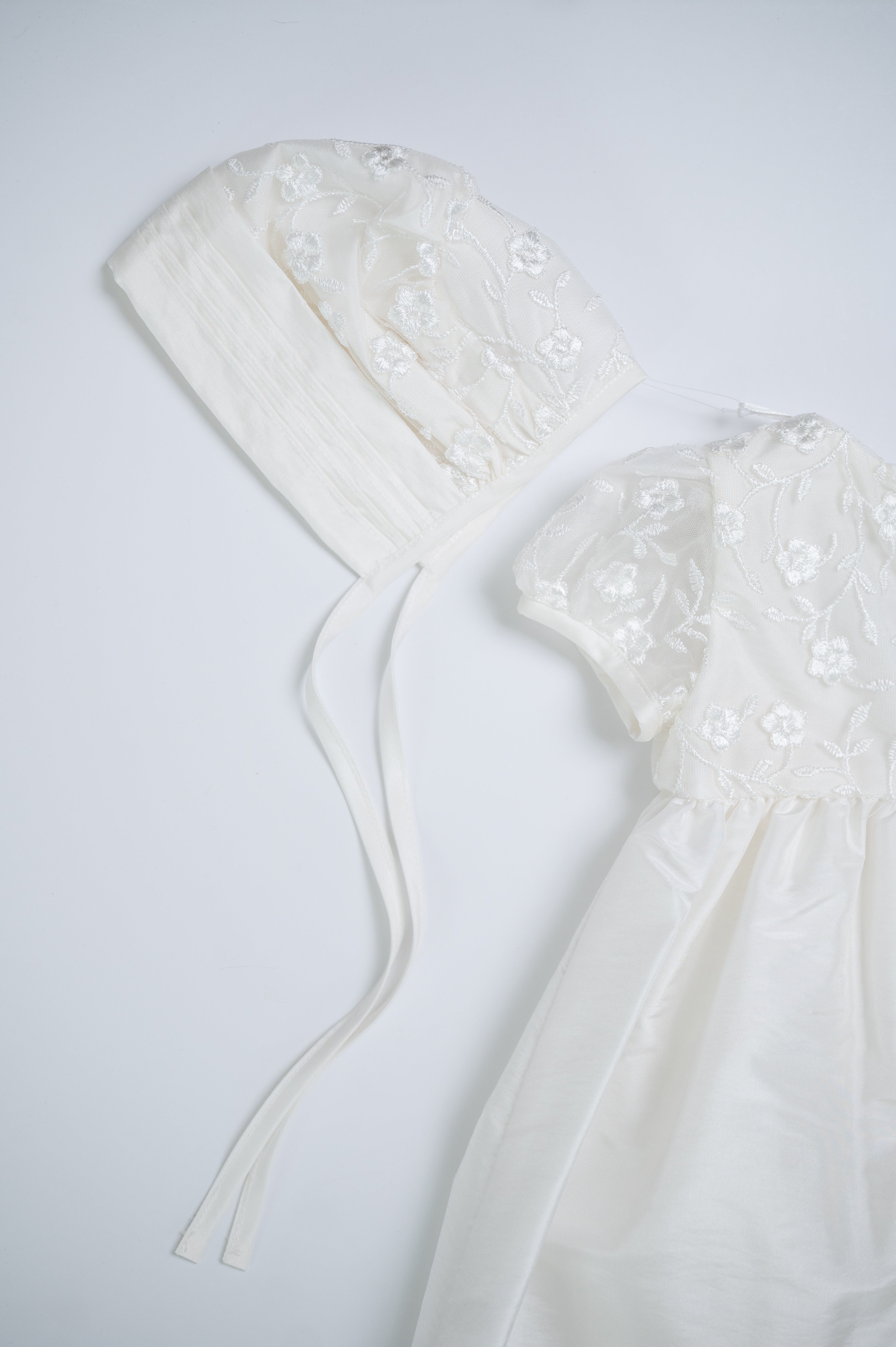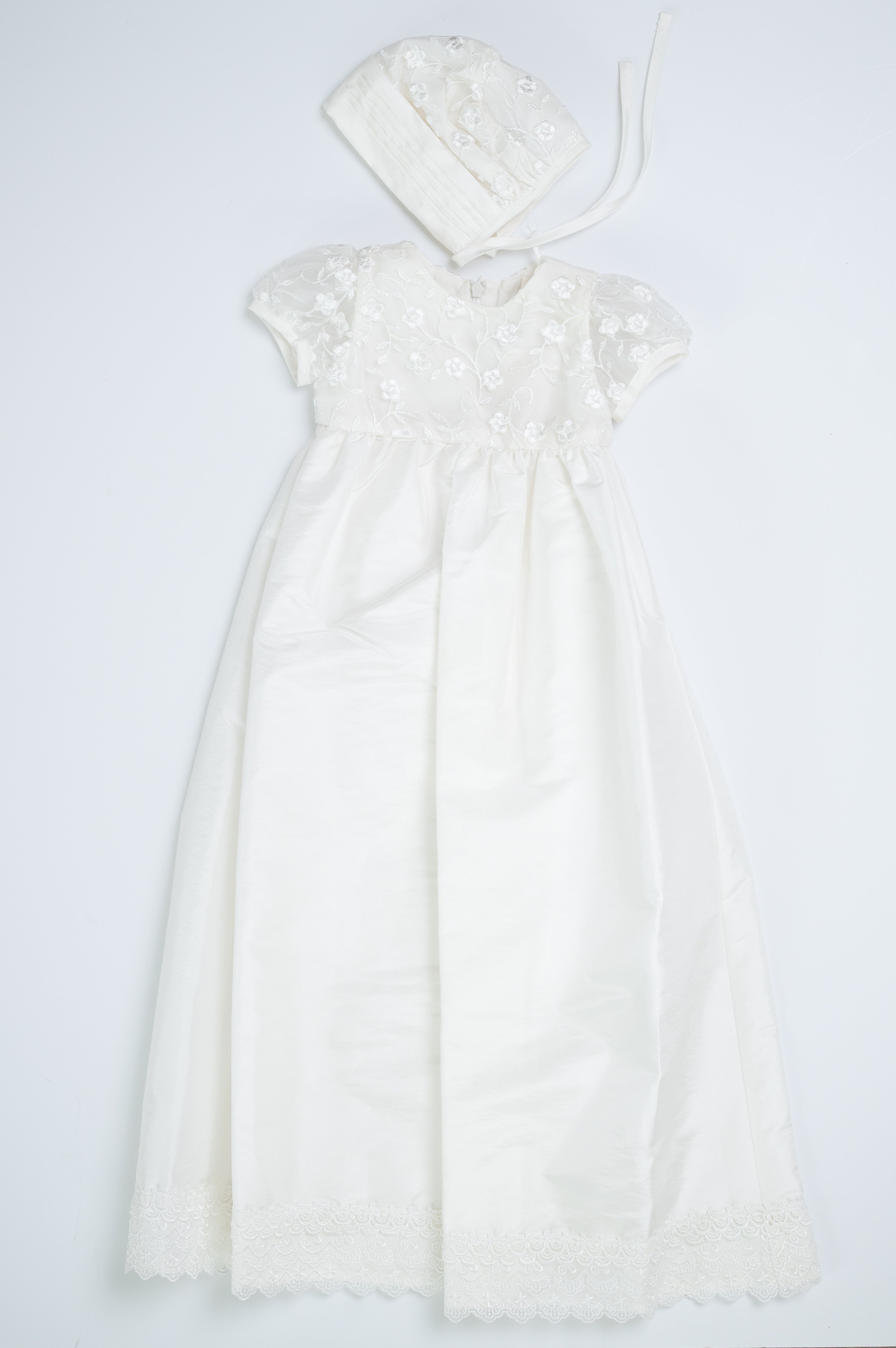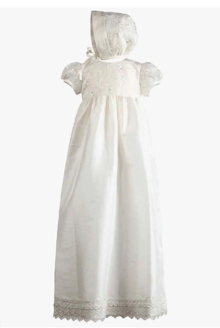 This beautiful Christening dress has a lace bodice and short sleeves. Around the hem is a beautiful a lace trim.