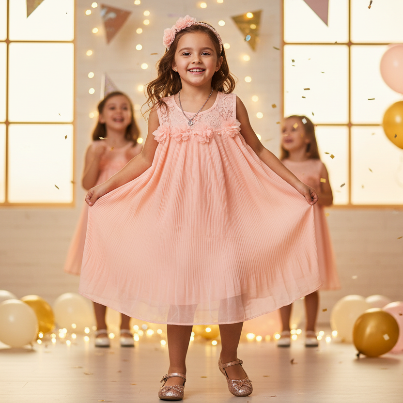 Our delightful Peach Floral Pleat Dress, designed to enchant little princesses with its charming elegance. Crafted with care and adorned with a delightful peach floral pattern, this dress embodies grace and sweetness.