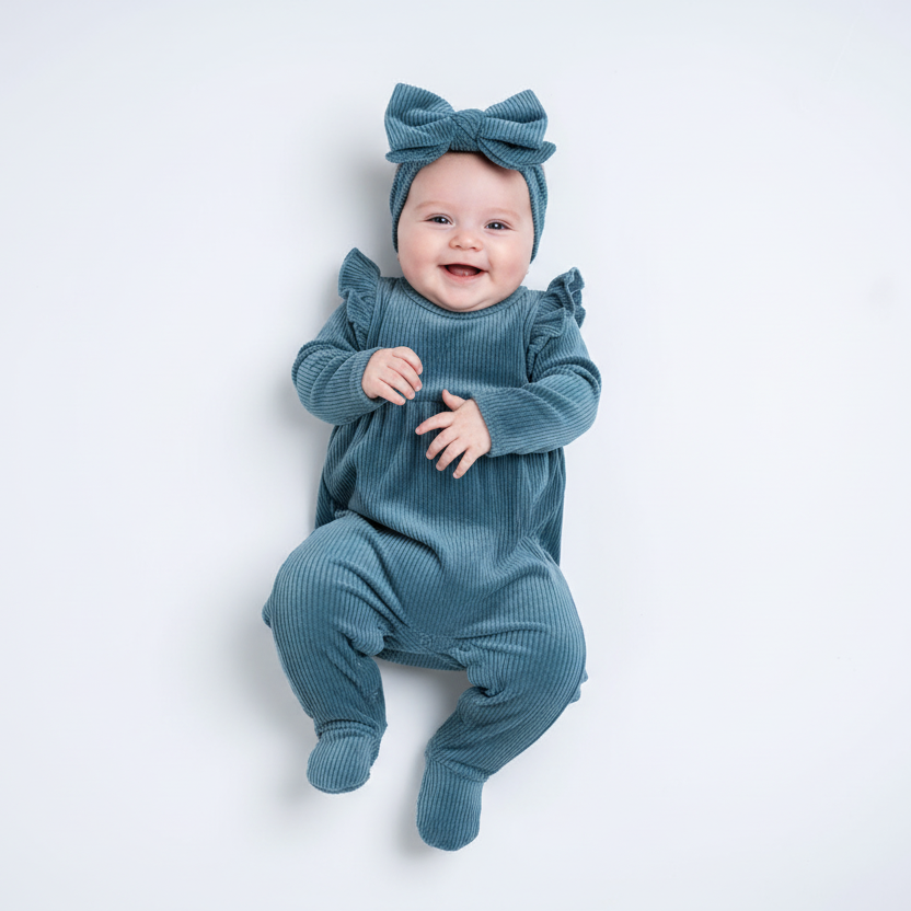 Wrap your little one in comfort and style with our Rib Velour Romper with Headband in Blue—a cozy, chic outfit perfect for any occasion. Made from luxuriously soft ribbed velour, this romper offers a gentle touch on delicate skin while keeping your baby snug and warm.