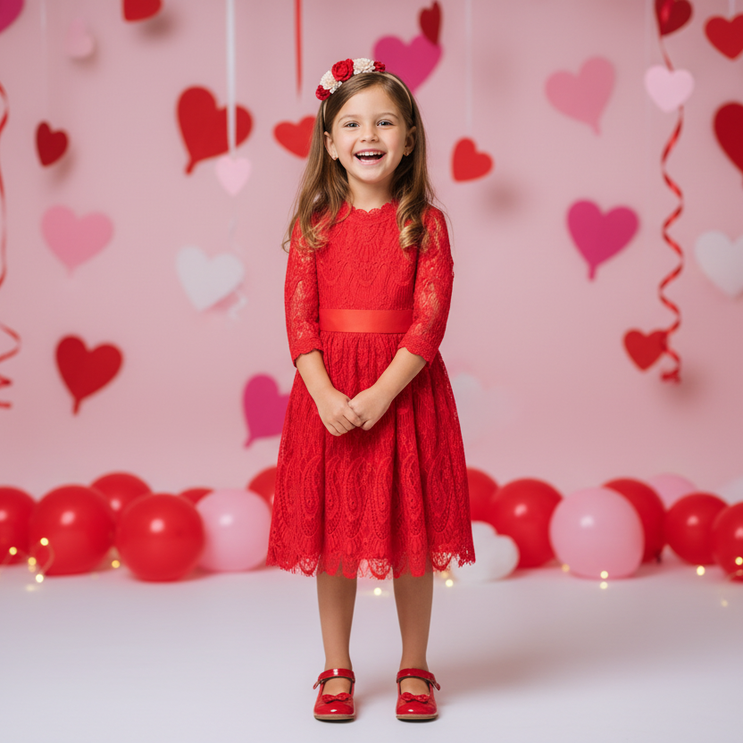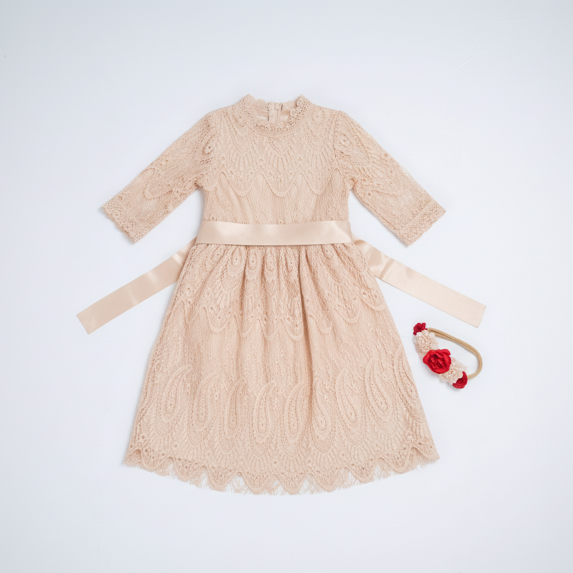 We love the elegance of this all lace dress complete with a full skirt and 3/4 length sleeves. Ribbon included.